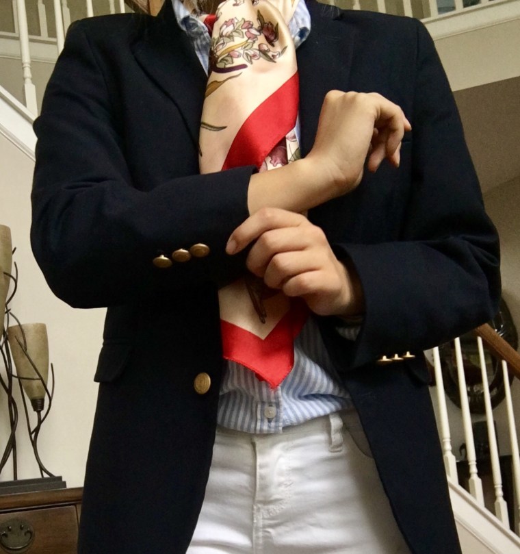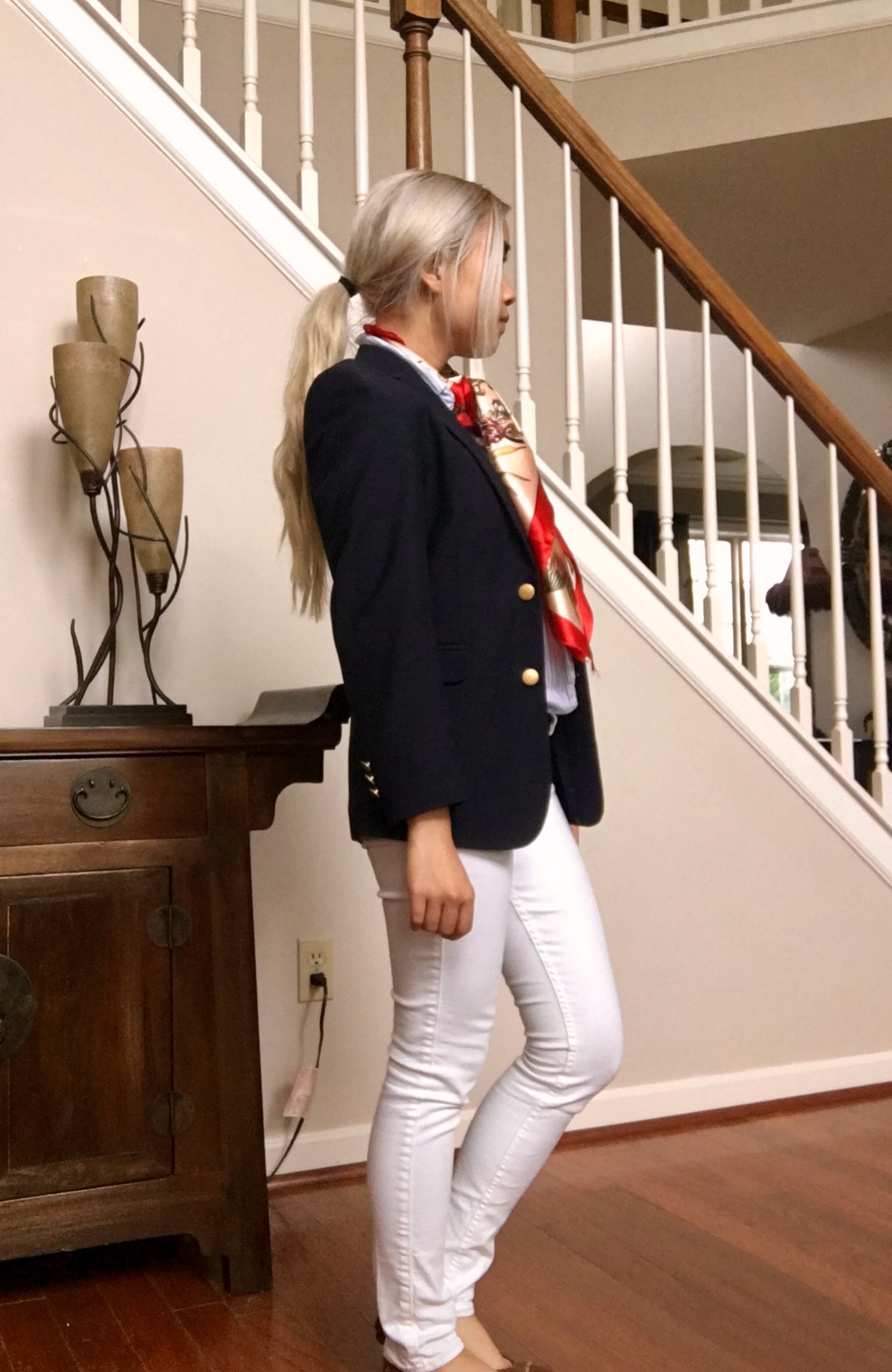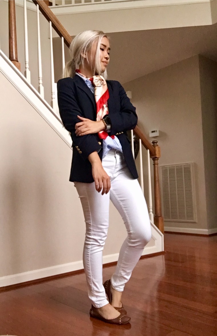 But that doesn’t mean I can’t celebrate the Derby here at home with my choices in clothing! I wanted something distinctively equine-looking for today, something totally different from the ripped jeans with fishnets I did yesterday. With my navy Chaps blazer, blue striped button down, red silk scarf, and white skinny jeans, I definitely felt like I could’ve walked out of a Polo ad.
