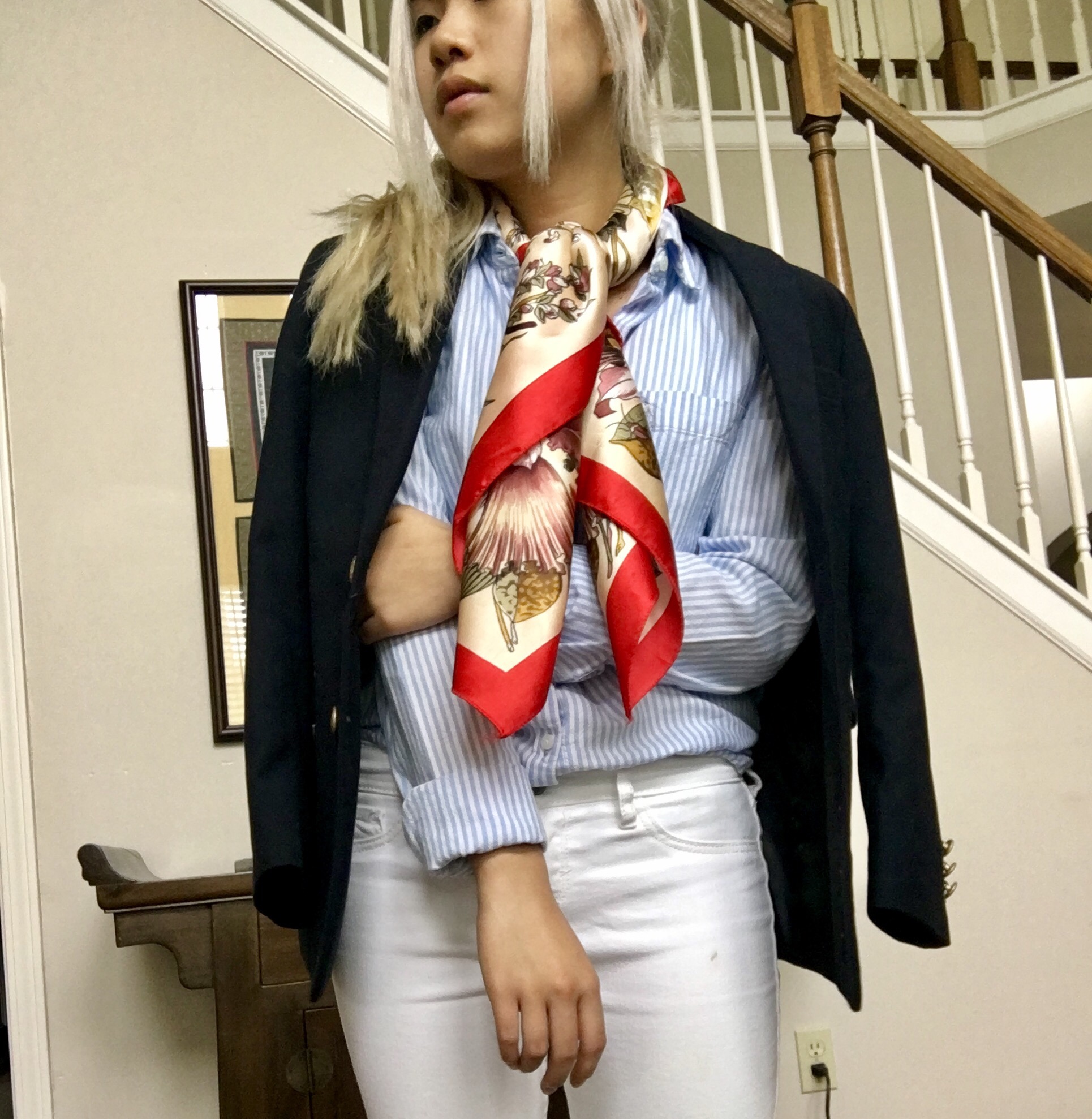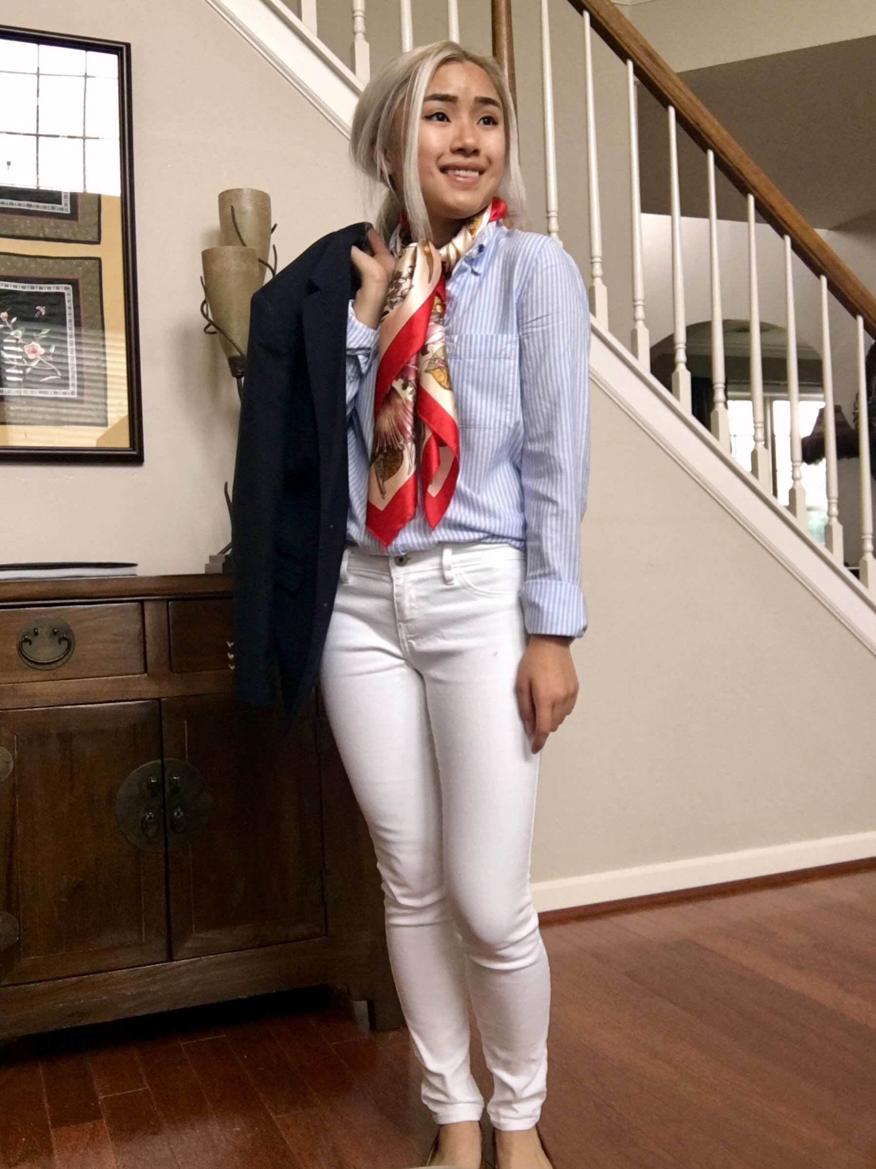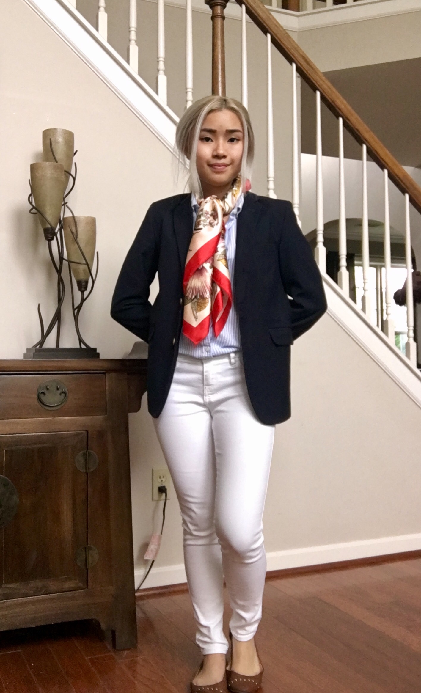 But that doesn’t mean I can’t celebrate the Derby here at home with my choices in clothing! I wanted something distinctively equine-looking for today, something totally different from the ripped jeans with fishnets I did yesterday. With my navy Chaps blazer, blue striped button down, red silk scarf, and white skinny jeans, I definitely felt like I could’ve walked out of a Polo ad.