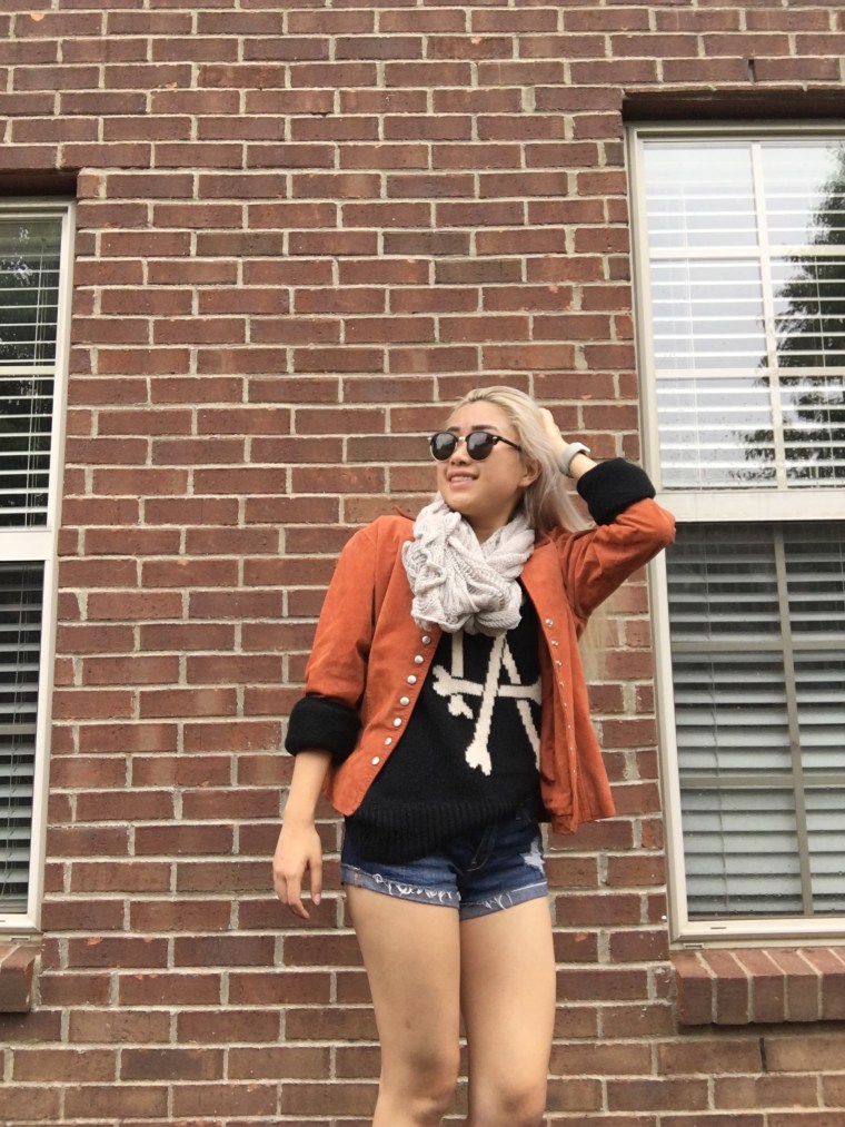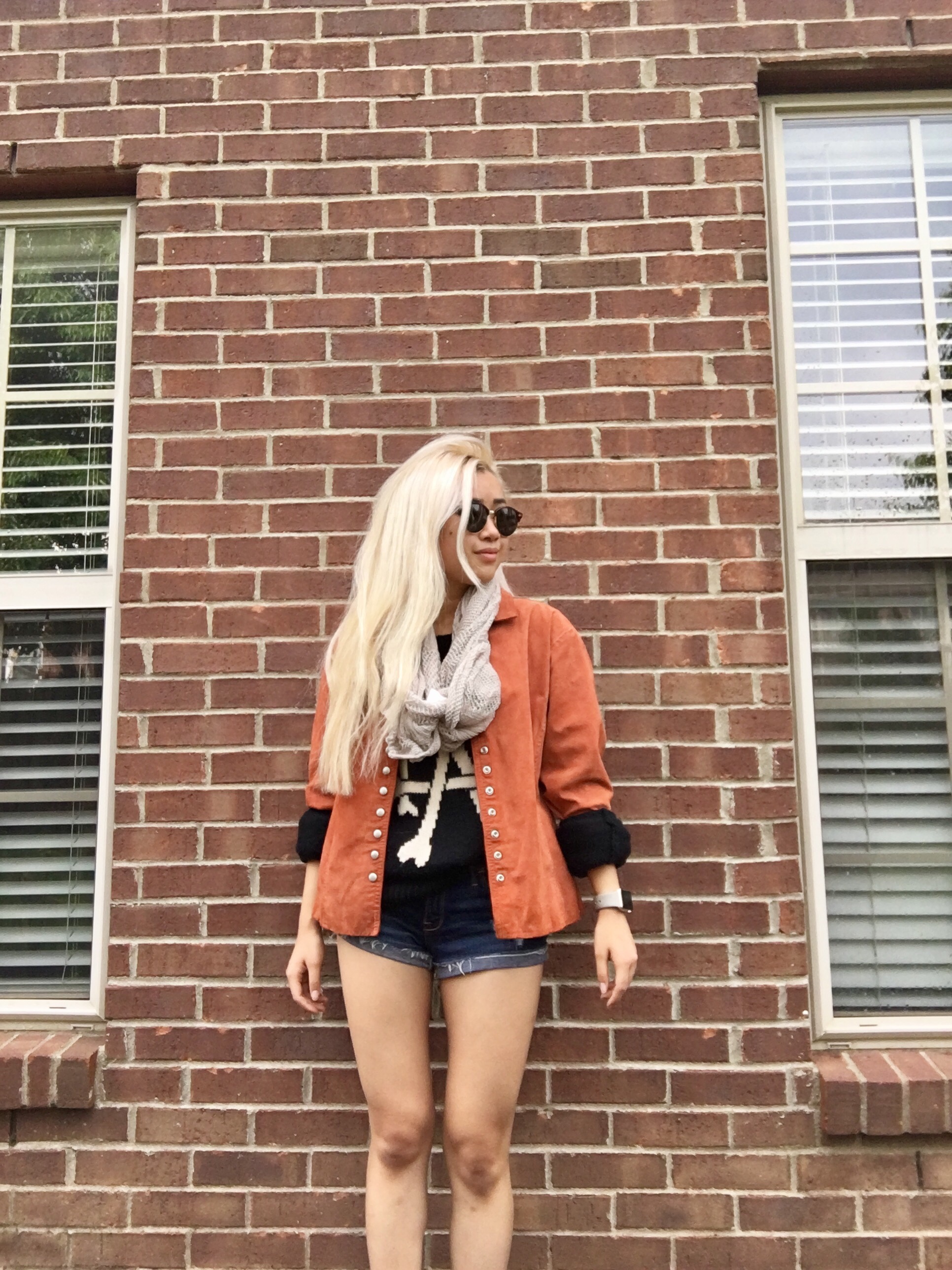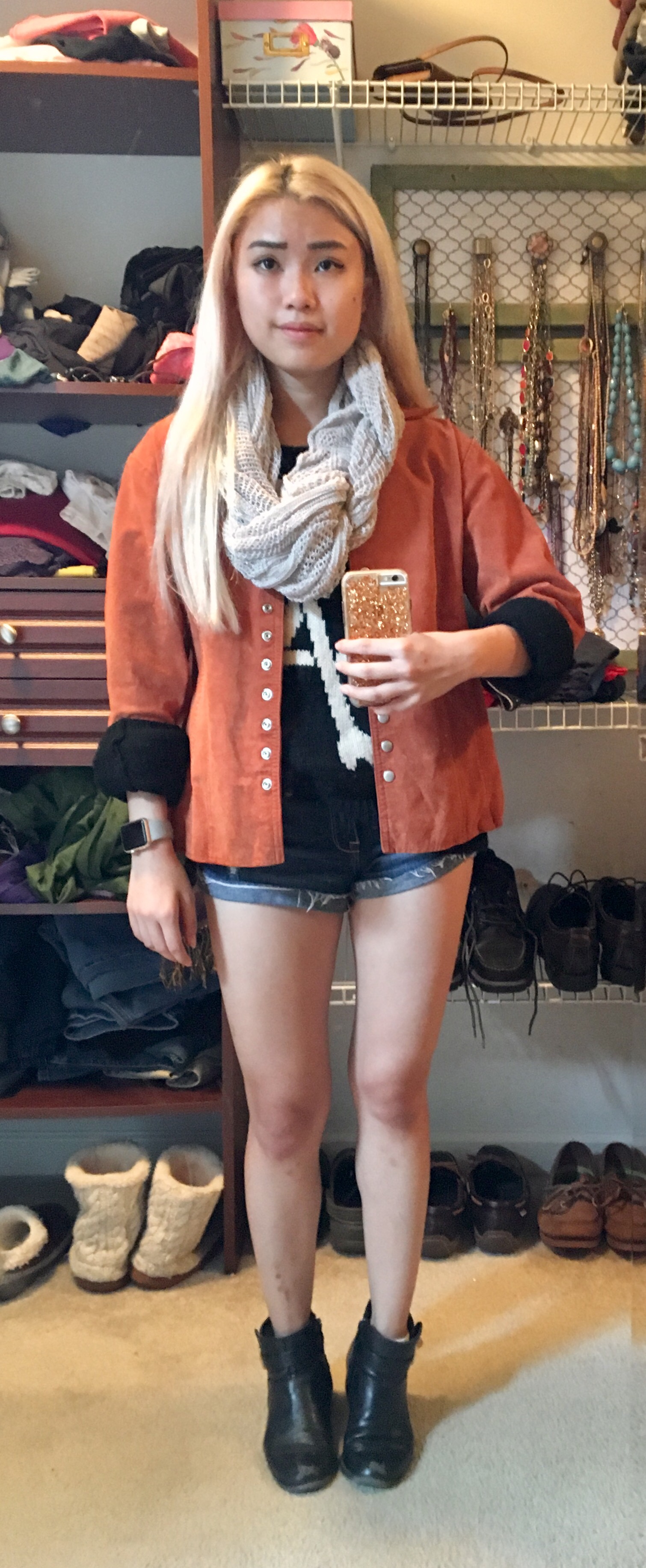 So the outfit ended up being based around this oversized suede jacket that I salvaged from my mother’s closet when she was about to give it to Goodwill. It’s from Coldwater Creek, back during the days when they had their own brick and mortar stores in just about every mall. Underneath, I wore a long black sweater tucked into some denim shorts. It was all about the contrast between the oversized, baggy tops and the short, fitted shorts.