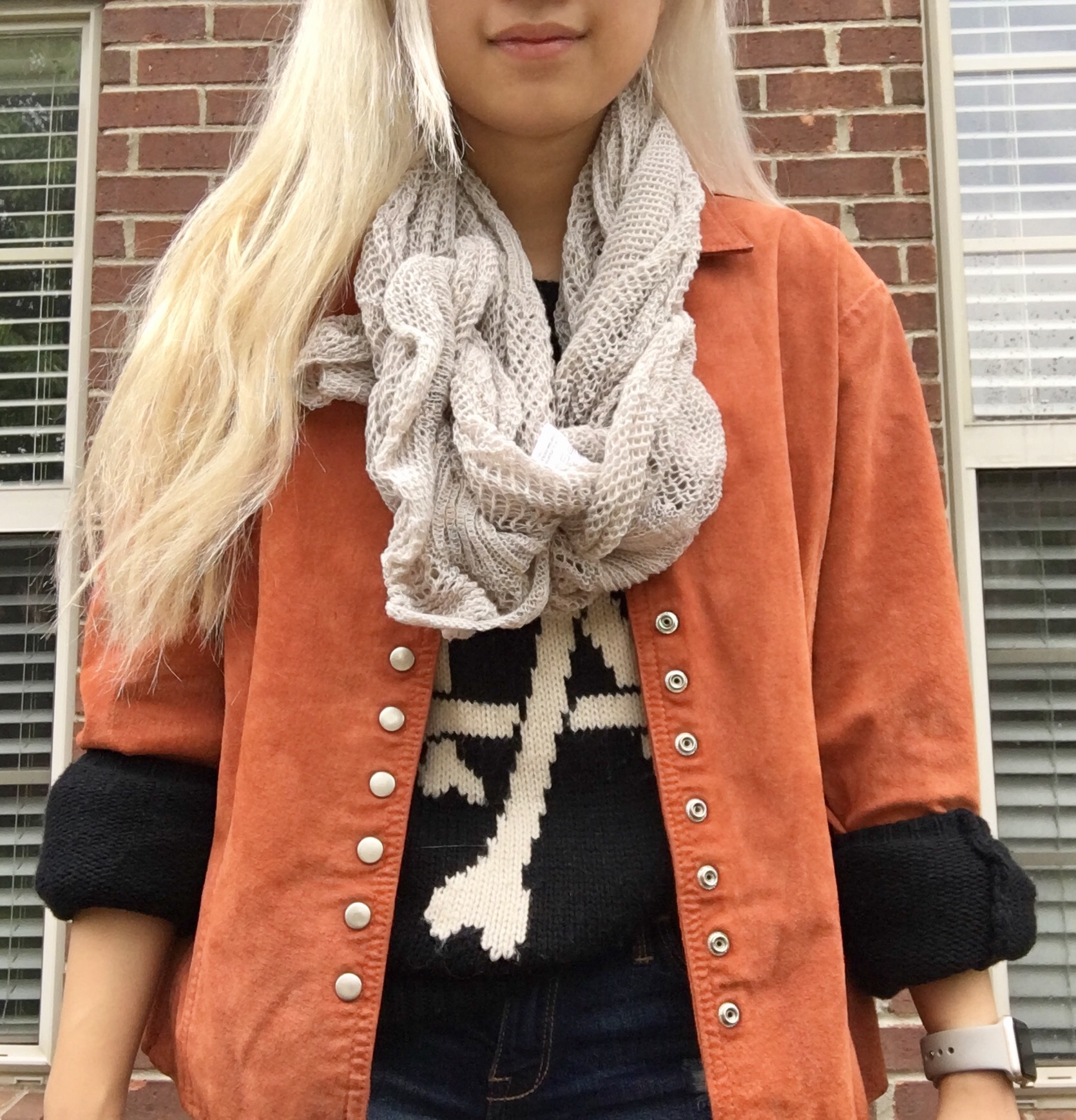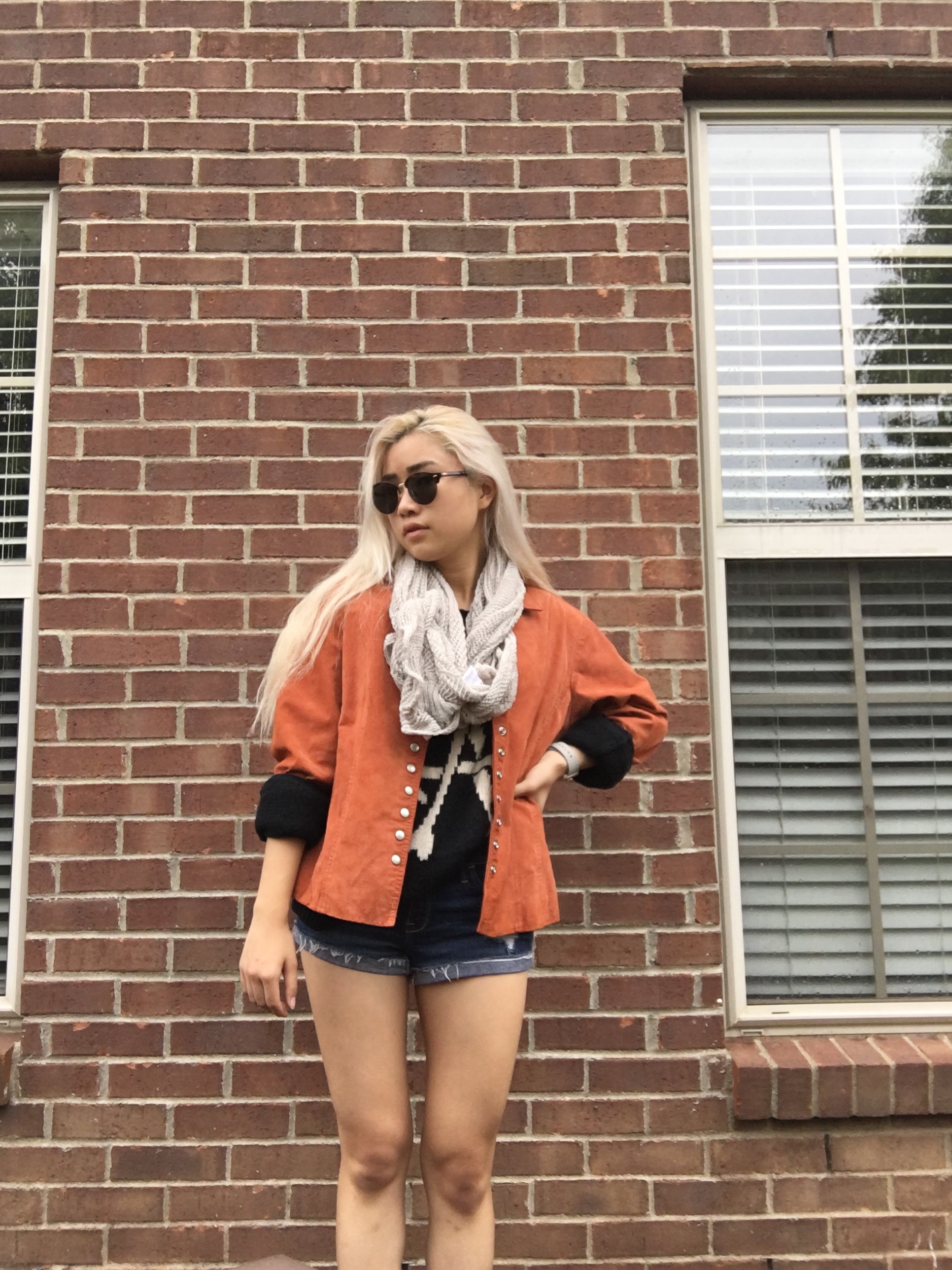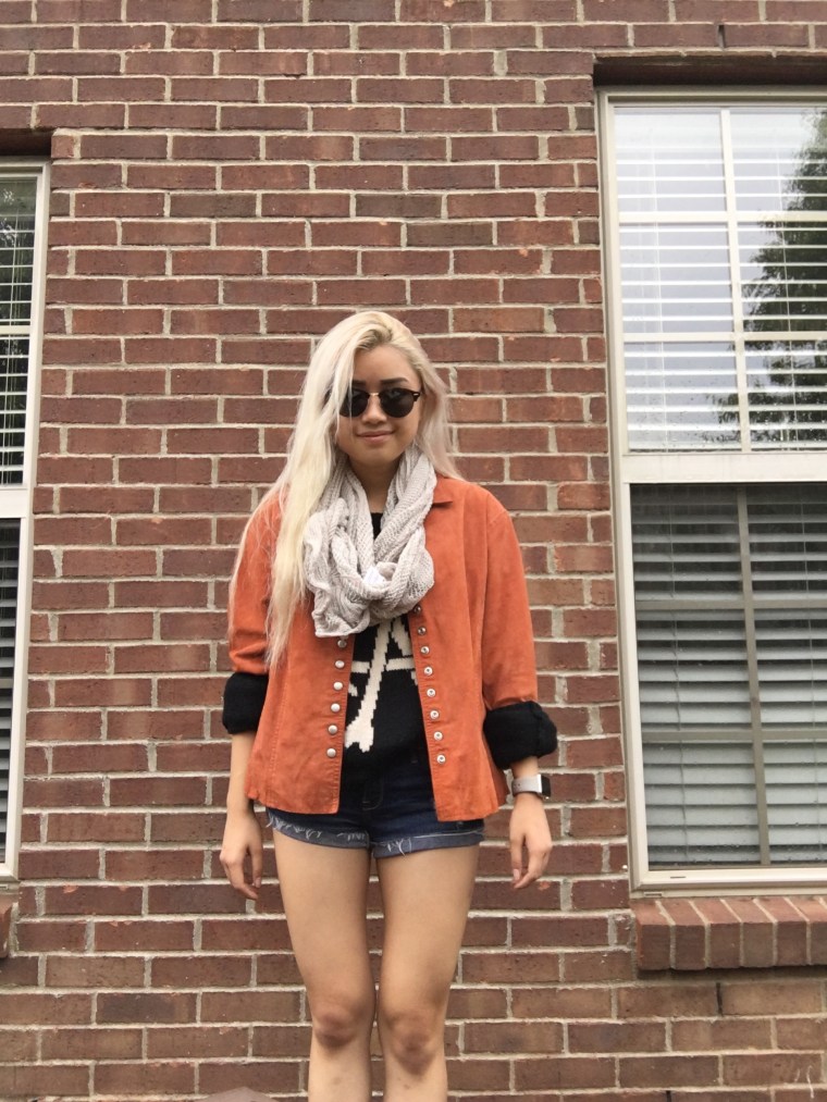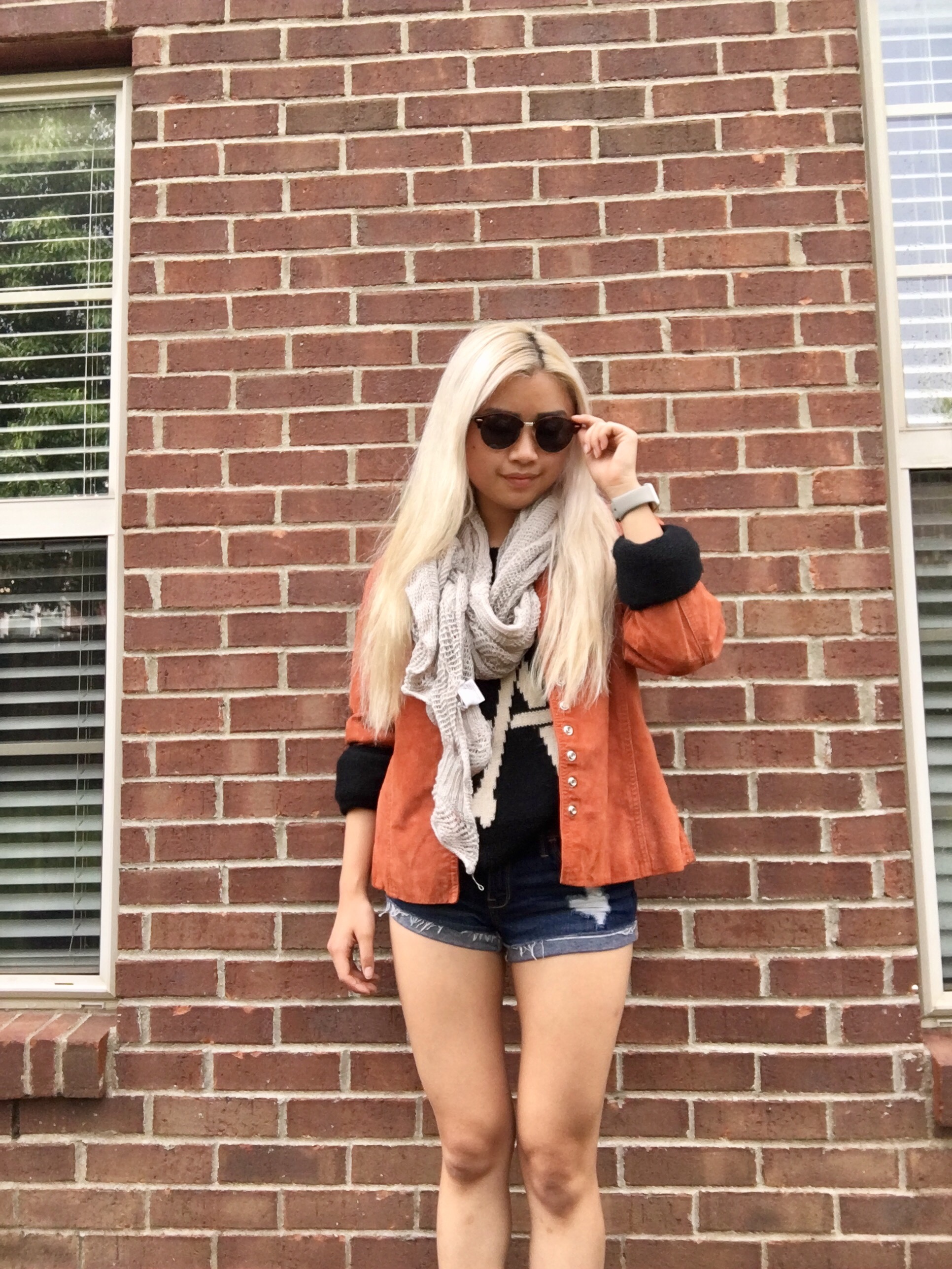 So the outfit ended up being based around this oversized suede jacket that I salvaged from my mother’s closet when she was about to give it to Goodwill. It’s from Coldwater Creek, back during the days when they had their own brick and mortar stores in just about every mall. Underneath, I wore a long black sweater tucked into some denim shorts. It was all about the contrast between the oversized, baggy tops and the short, fitted shorts.