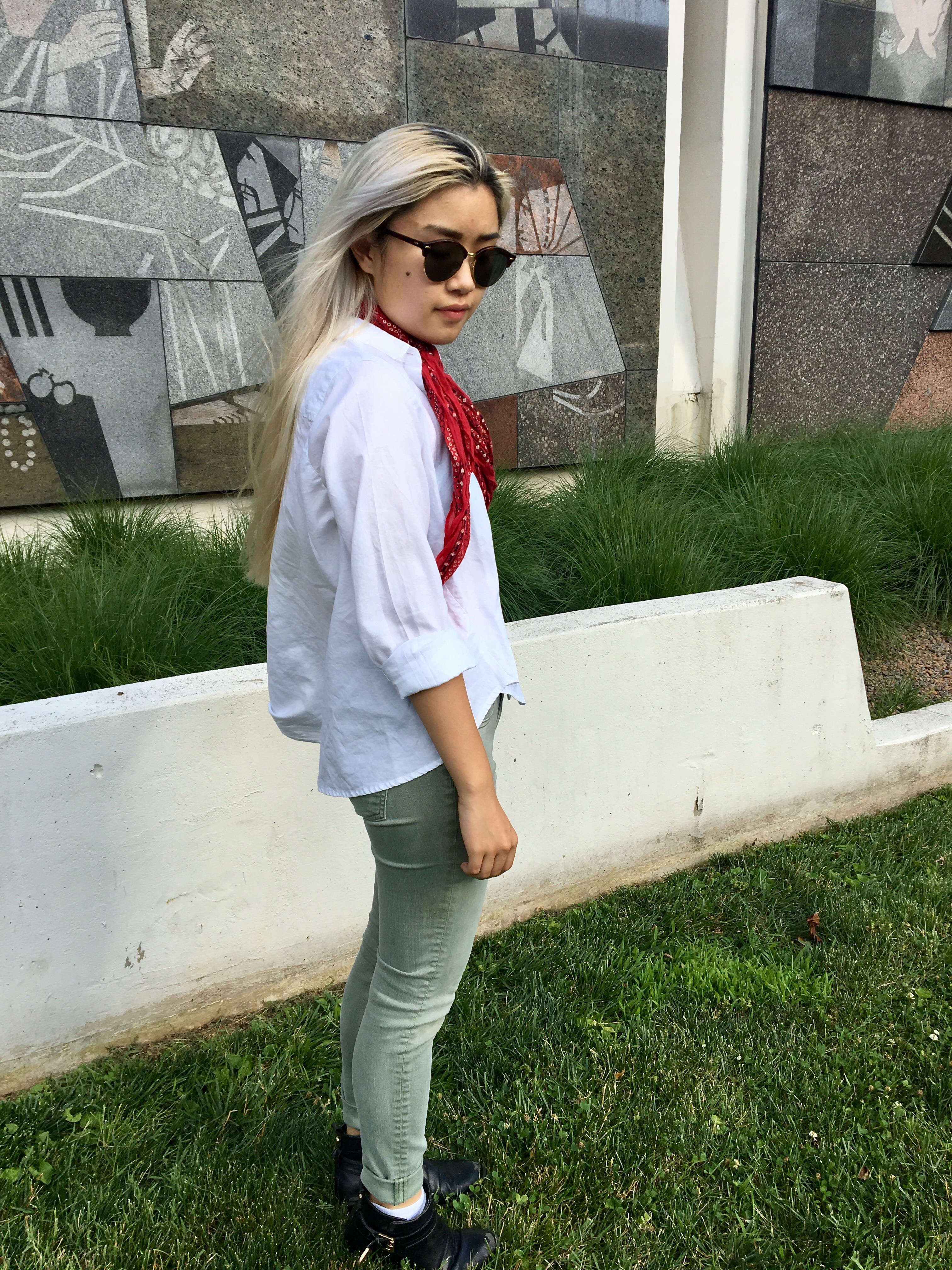 Anyway, today’s outfit – in addition to my plain white shirt (which isn’t so plain when you look at it a bit more closely; it’s got a nice architectural silhouette that makes it rather interesting), I wore a bandana-printed neck scarf, which I bought for the pure intention of looking trendy and green skinny jeans that make my legs feel just a tad like they’re being suffocated.