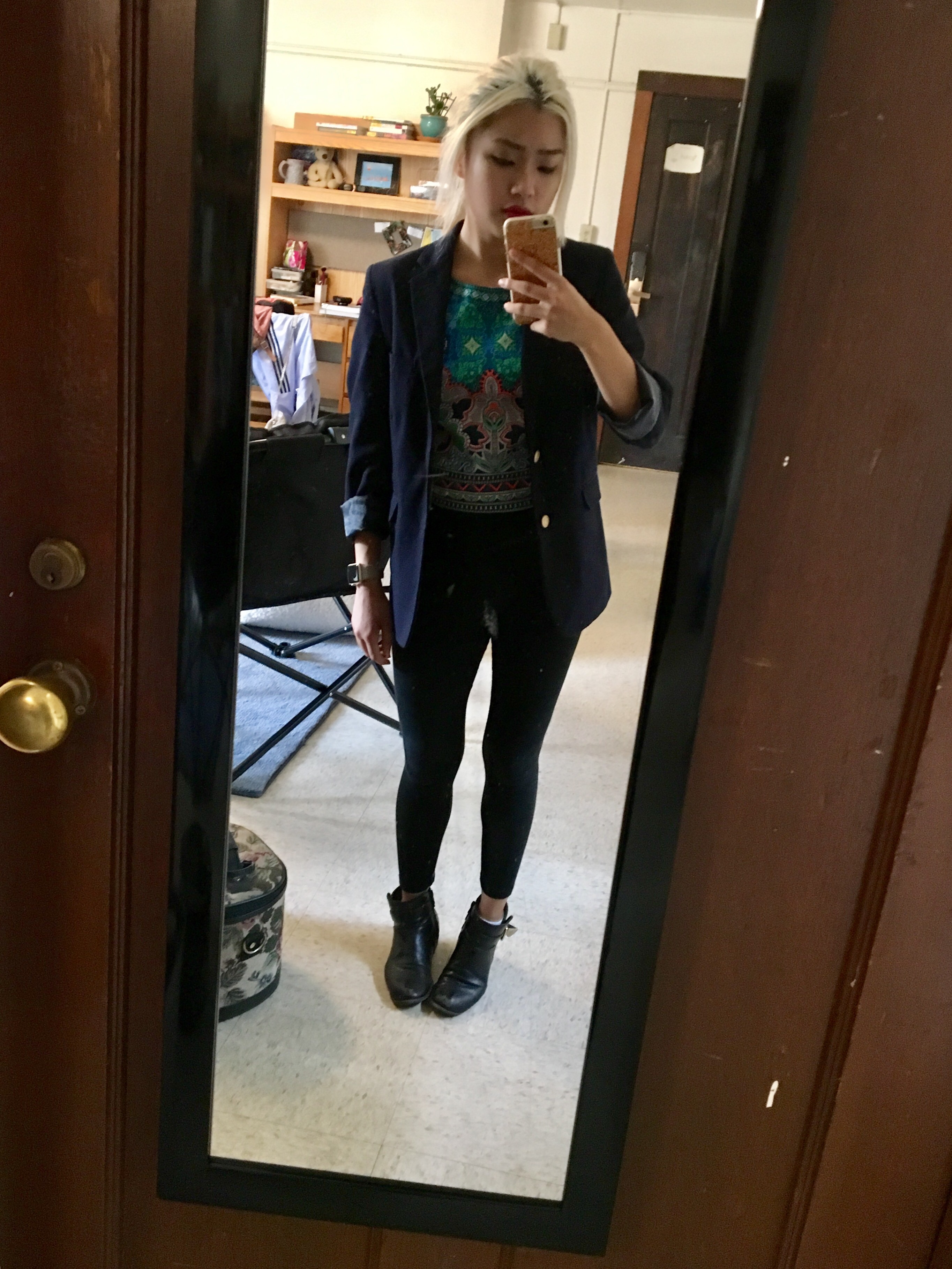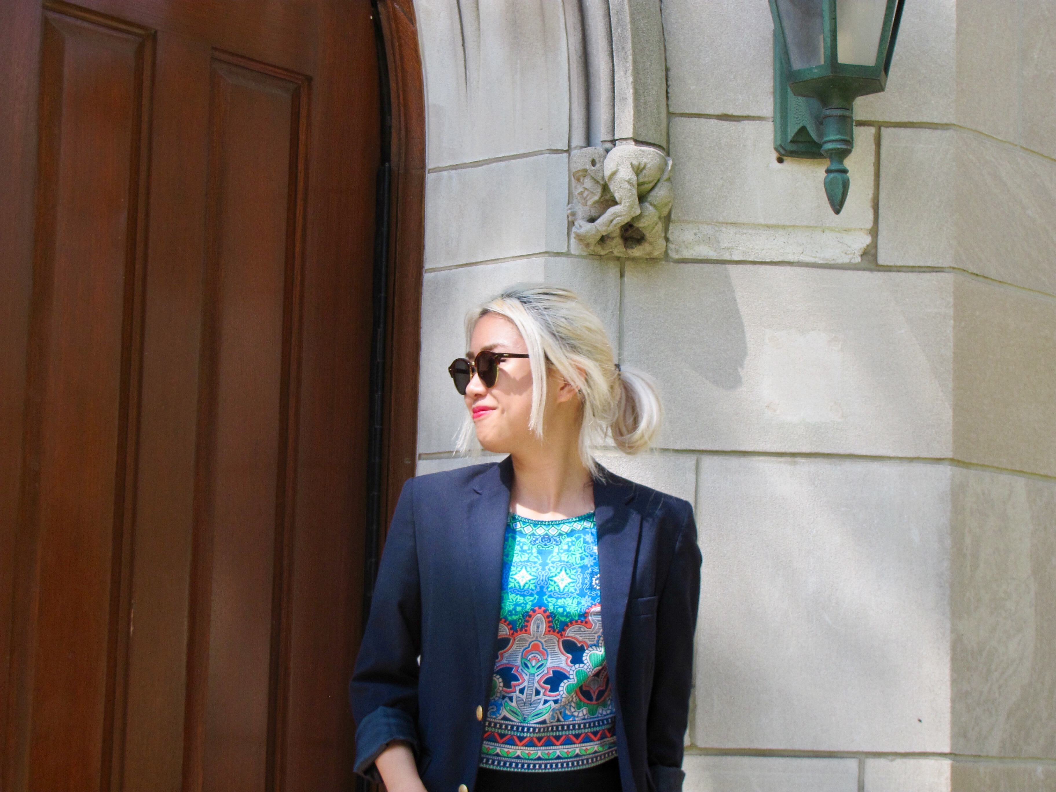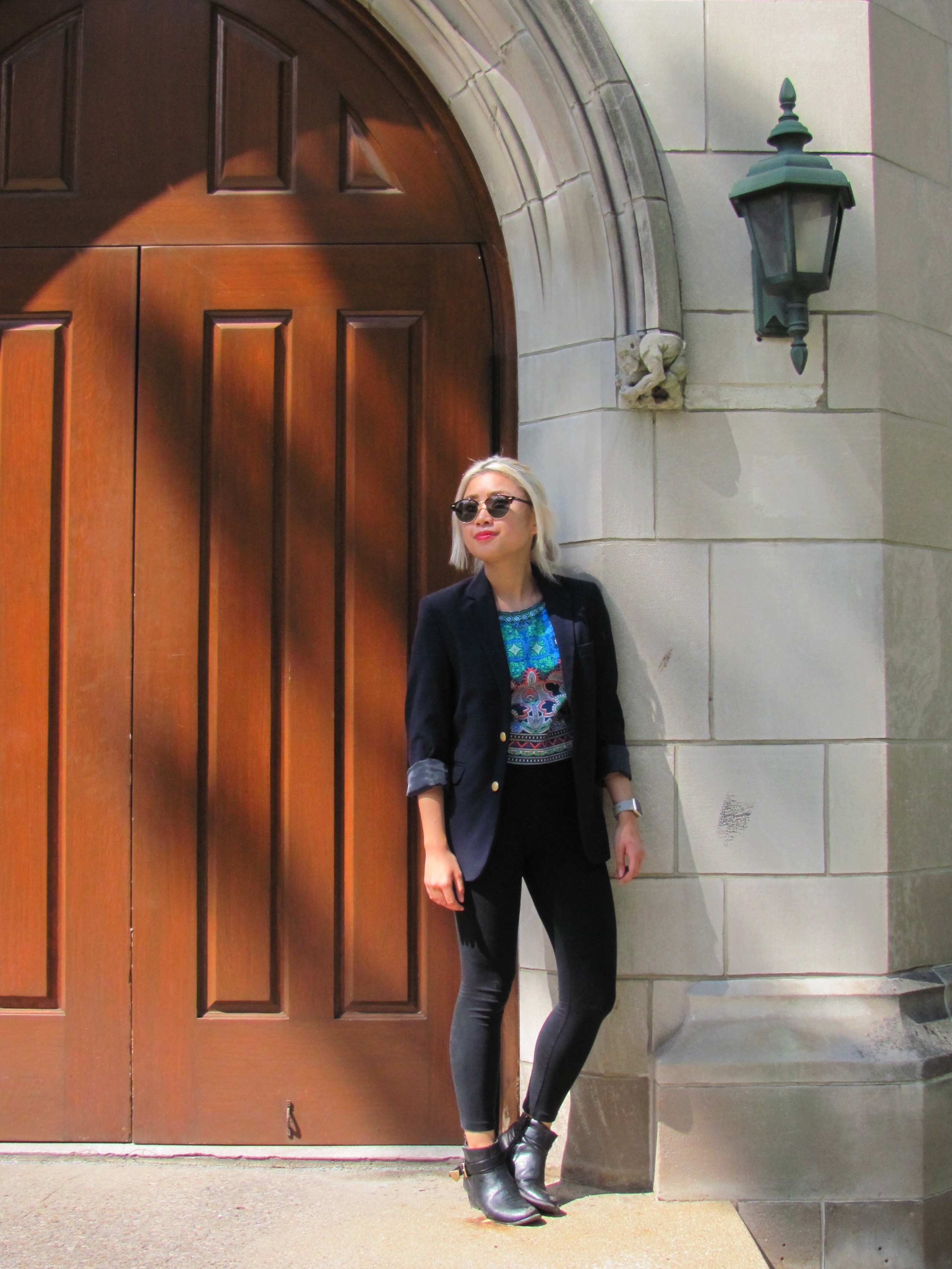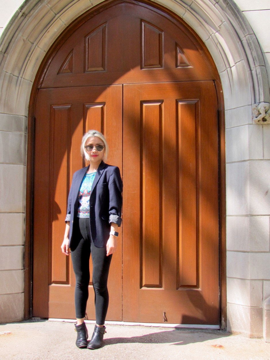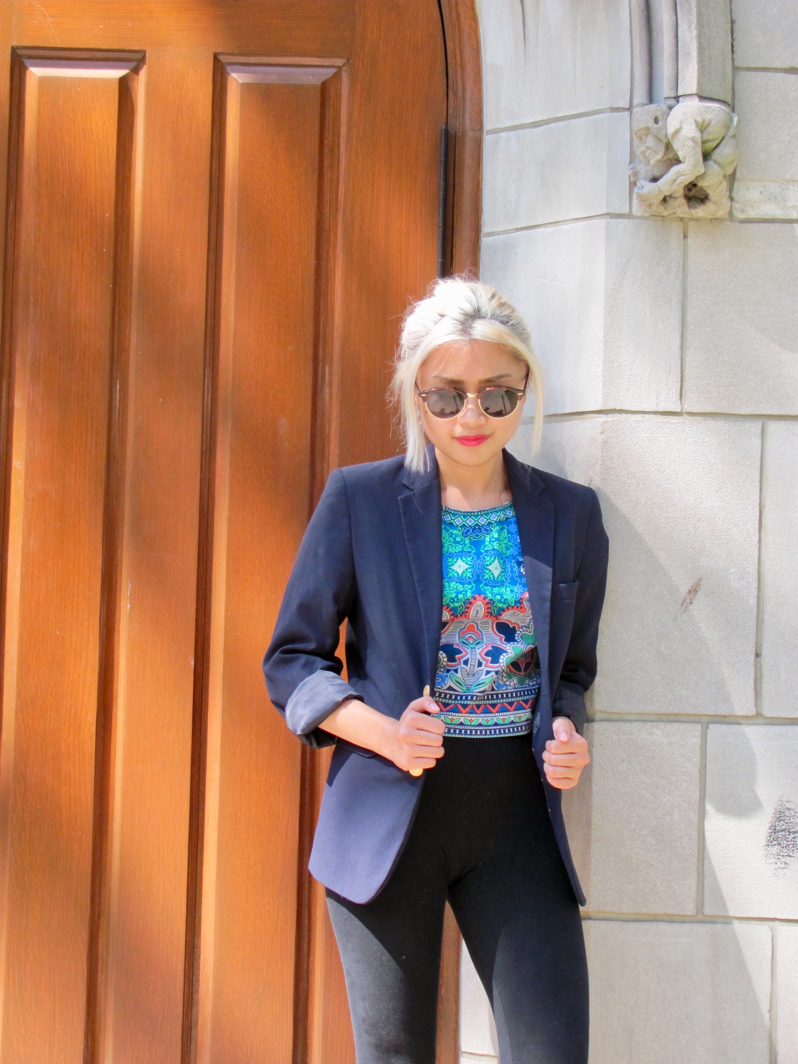 As for today’s outfit, you might notice it’s not entirely different from one I posted rather early on in my blog-writing career (you know, which began a whopping four months ago). I wasn’t a huge fan with how it turned out, though, in terms of pictures, as that was from a time when I was still taking my own pictures by setting up my iPhone with a timer. Thus, I decided to remix it, taking what I did rather enjoy about the outfit – the combination of a simple black pair of leggings with the bright, colorful top – adding some new elements – the navy blazer – and then photographing it with an actual camera.