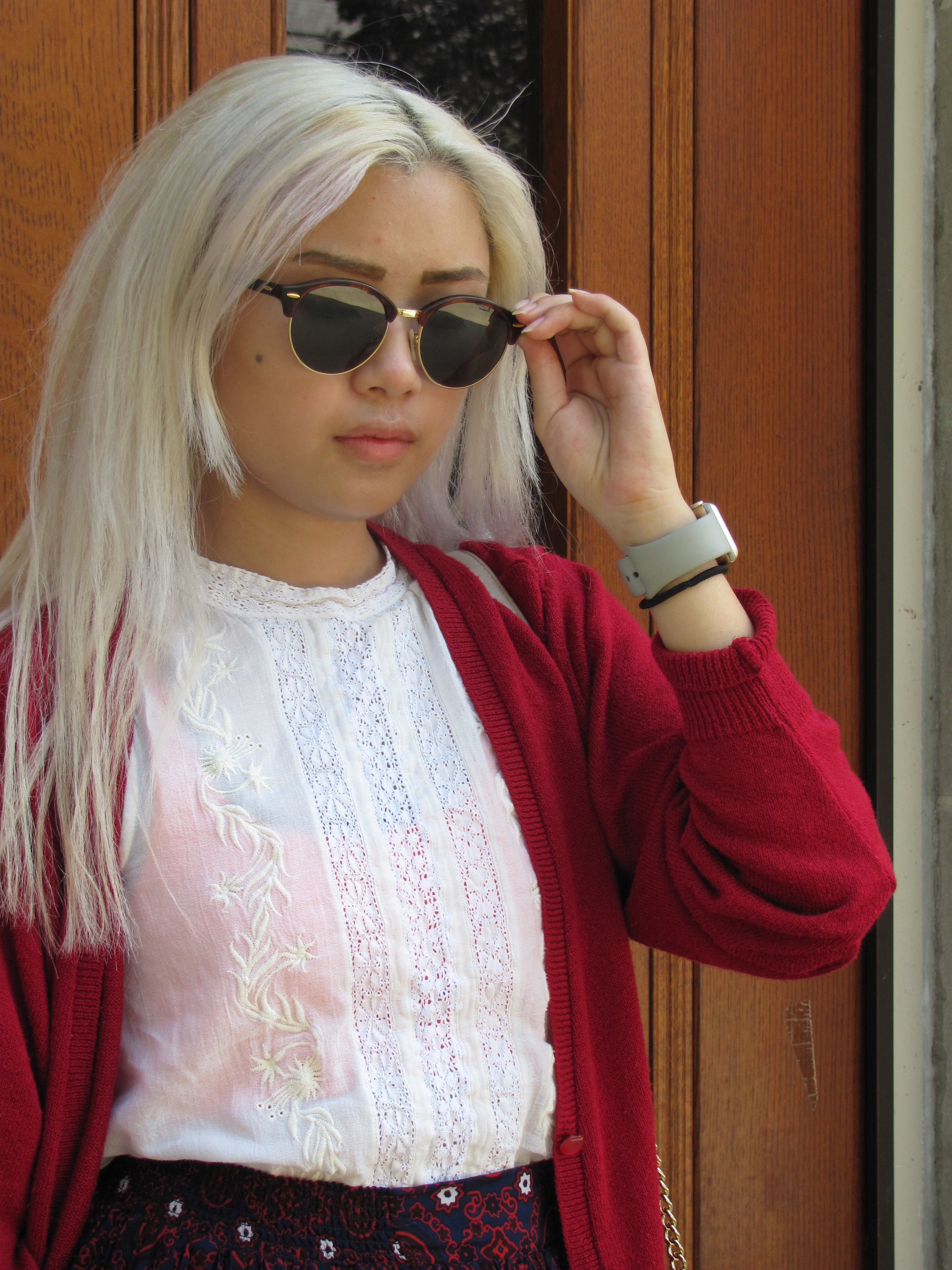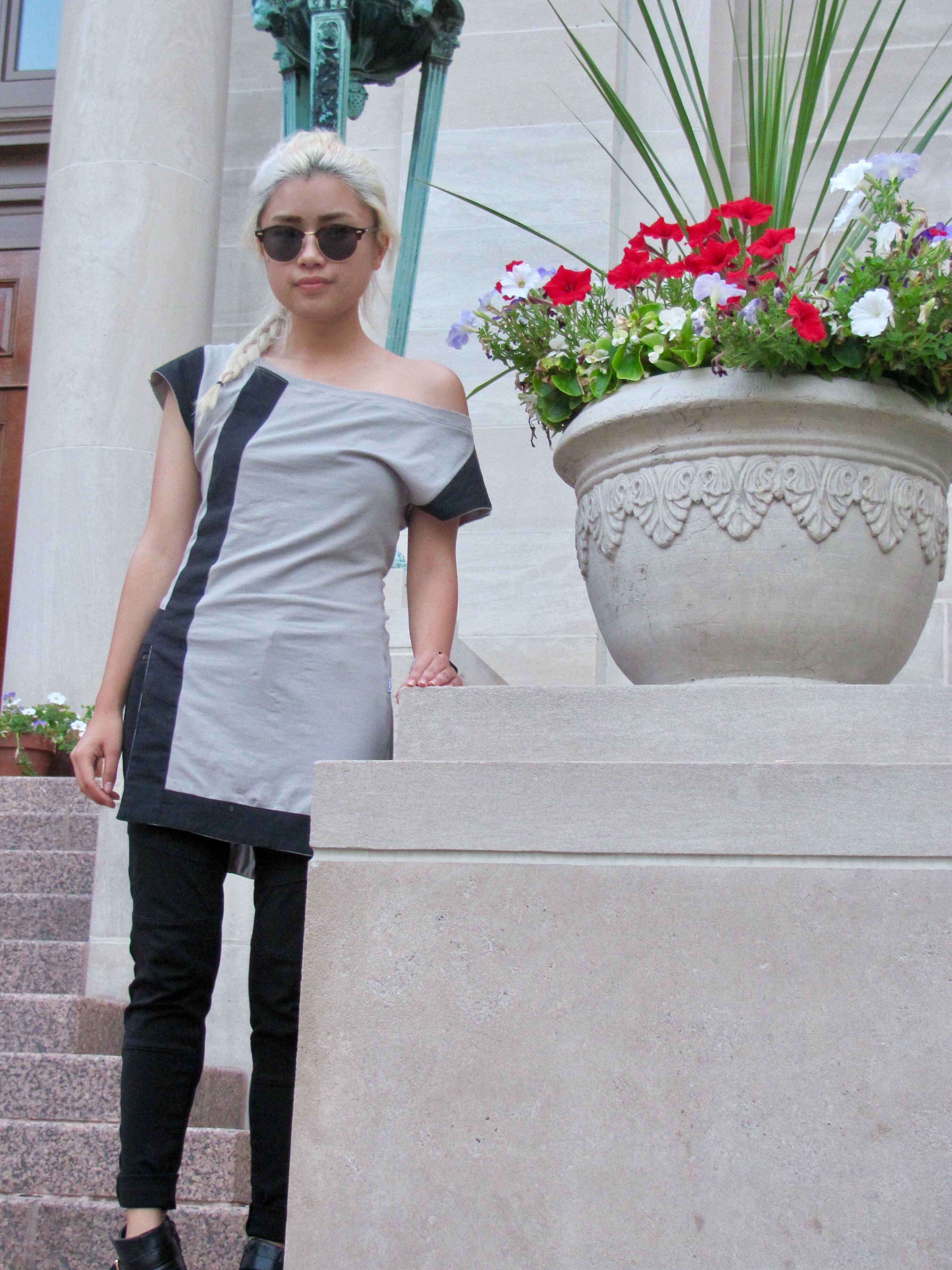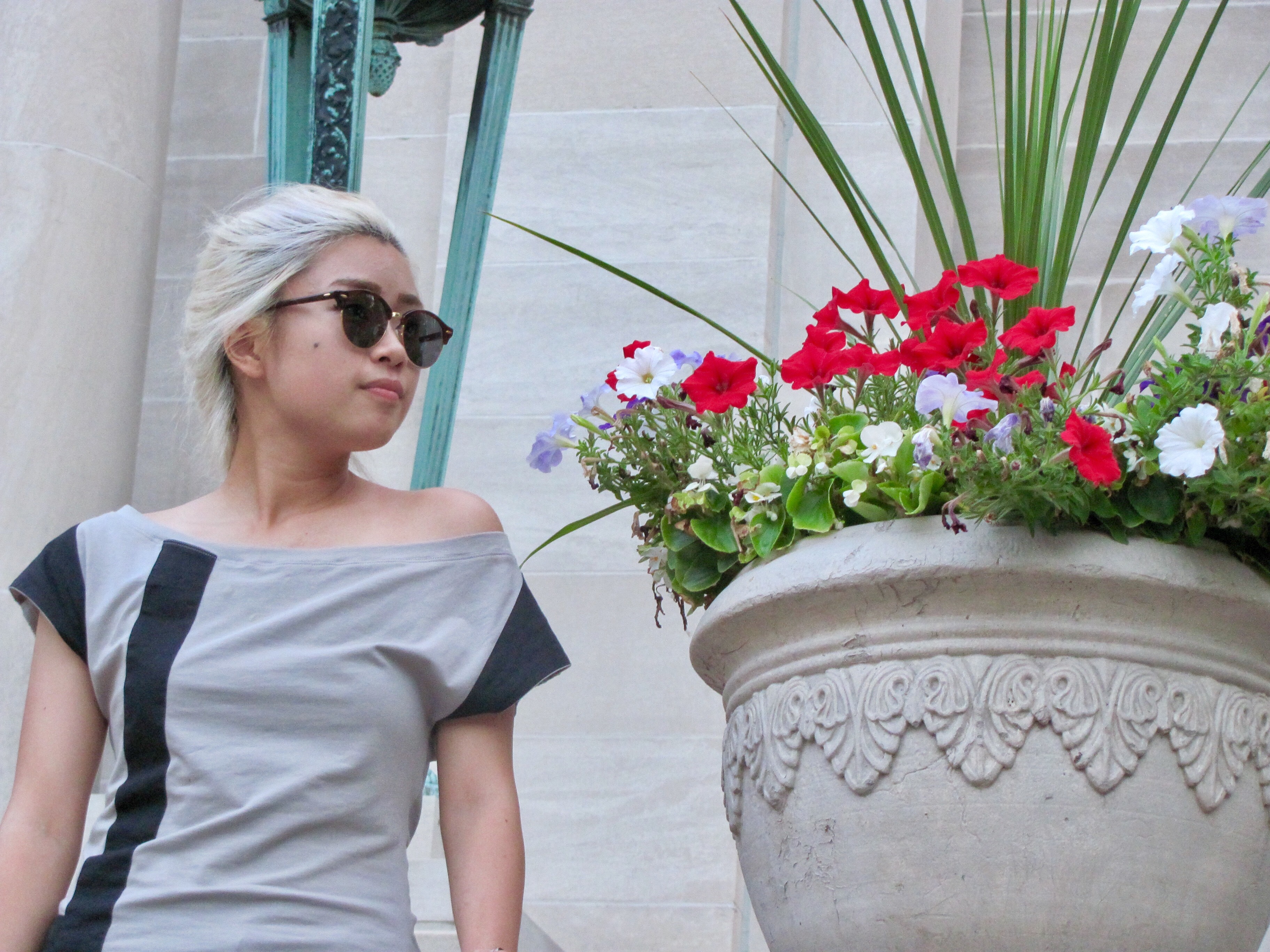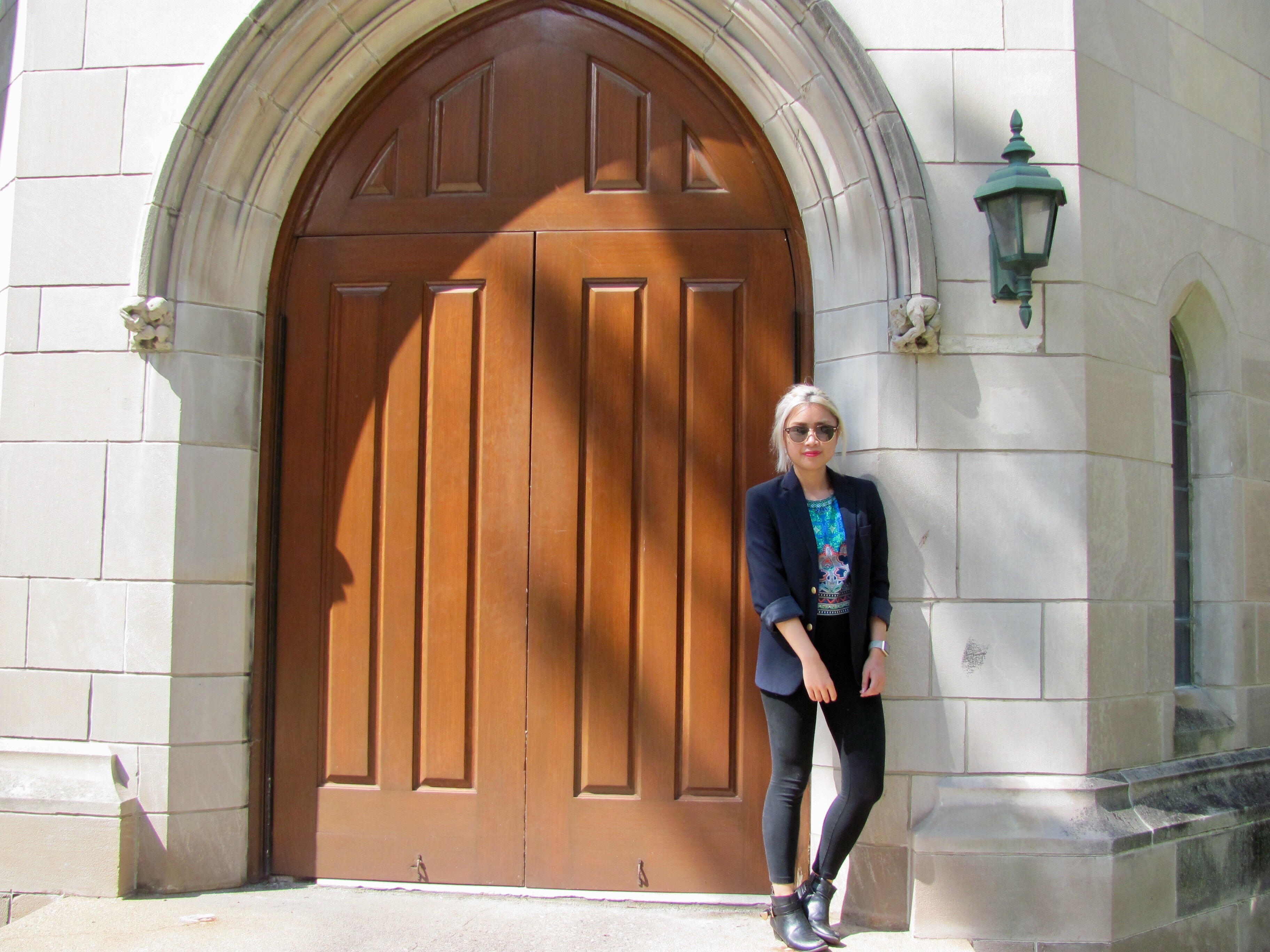 As for today’s outfit, you might notice it’s not entirely different from one I posted rather early on in my blog-writing career (you know, which began a whopping four months ago). I wasn’t a huge fan with how it turned out, though, in terms of pictures, as that was from a time when I was still taking my own pictures by setting up my iPhone with a timer. Thus, I decided to remix it, taking what I did rather enjoy about the outfit – the combination of a simple black pair of leggings with the bright, colorful top – adding some new elements – the navy blazer – and then photographing it with an actual camera.
