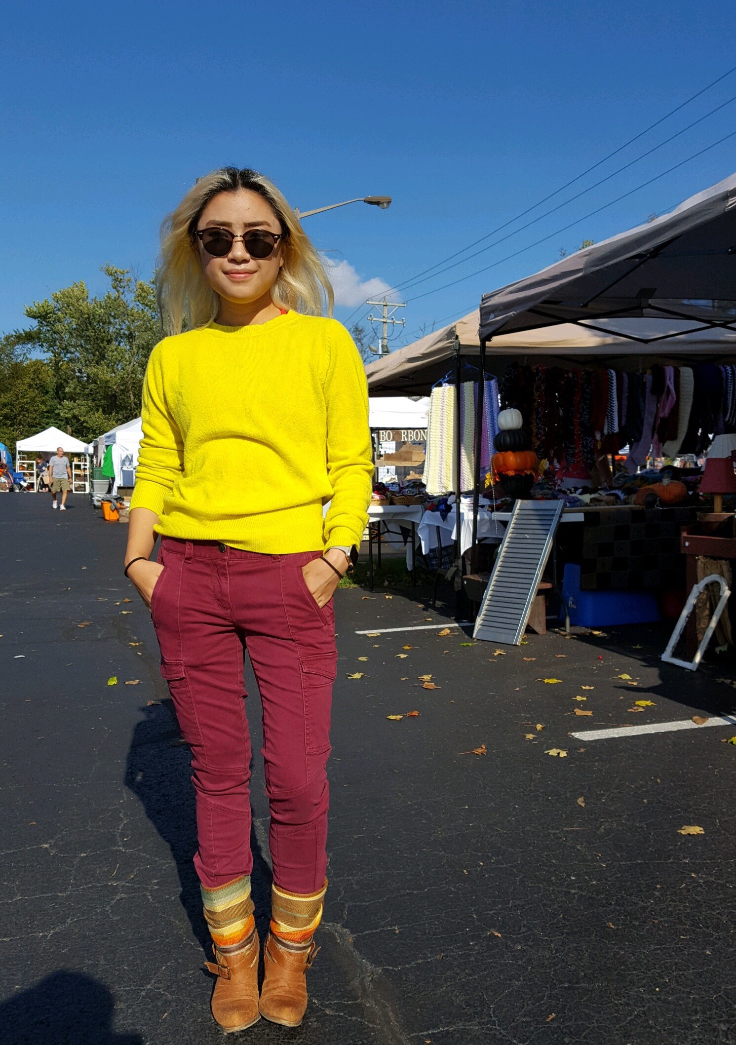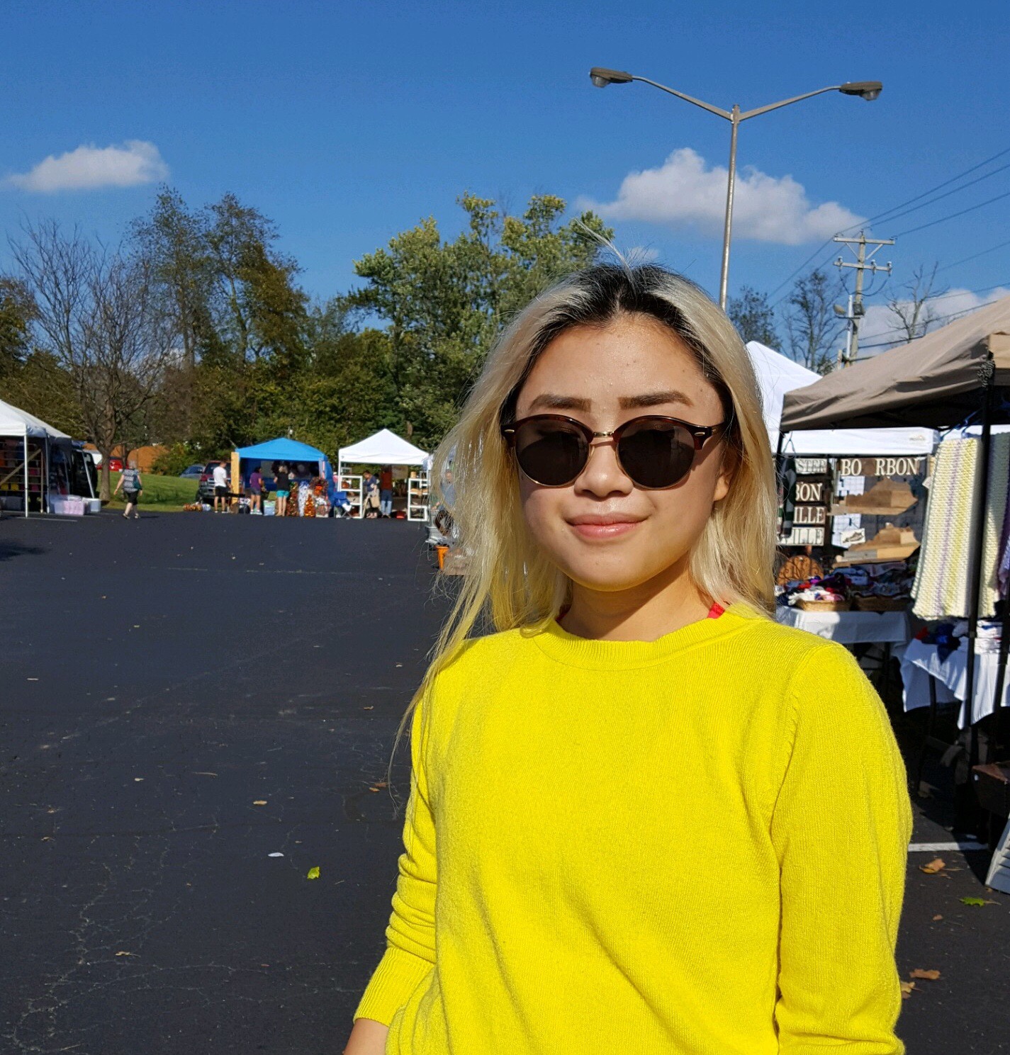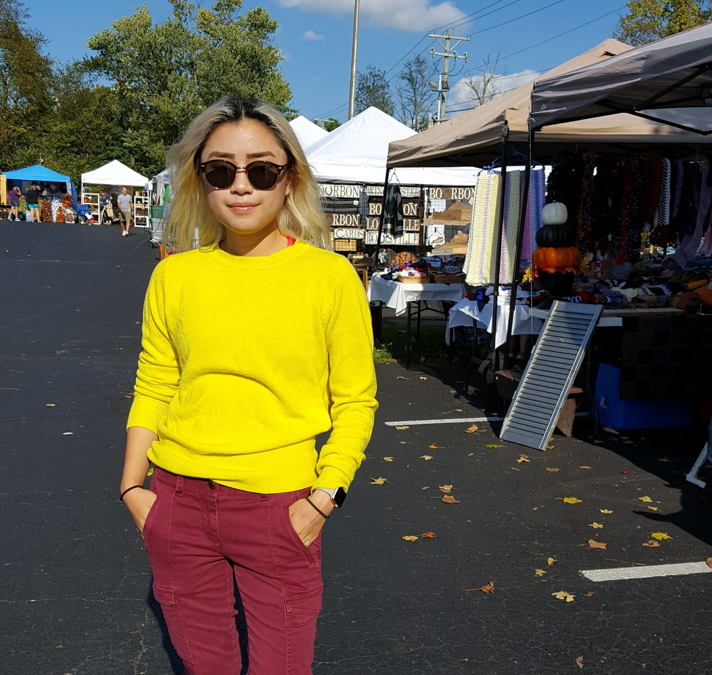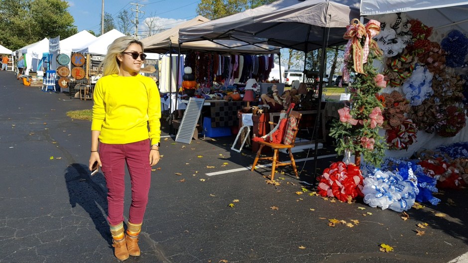 Sleeping in my bed has been the greatest part about being home. Eating a crap ton of junk food and my mother’s cooking and not exercising at all has been lovely too. Having my parents to drive me around places (since I’m not allowed to have a car on campus) was also great – it meant I could go to craft fairs like this one I’m so cheerily posing in front of in these photos.