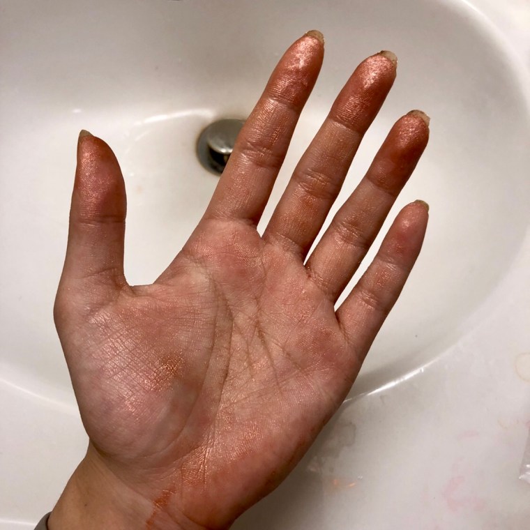 What the directions don’t say is just how messy this product is. Don’t expect to be able to apply this in white clothing and get away unscathed. In the case of my color, Rose Gold, I found my issue wasn’t so much the color rubbing off into my hands or my clothes, but the glitter. This is a picture of my hands just after application: