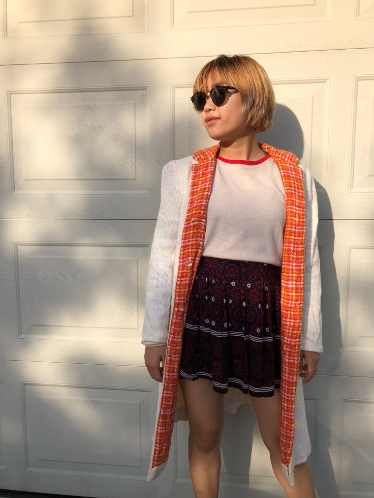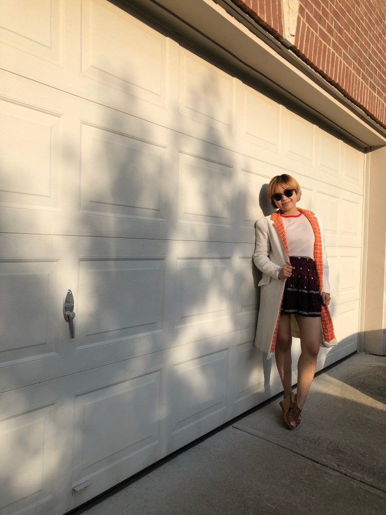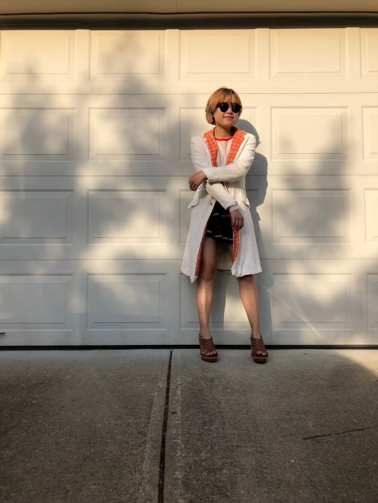 And yet there I was — wearing a knee-length jacket and a long-sleeve sweater. The skirt and the platform wedges give hint to the reality that it was probably 85 degrees out and sunny, but on the whole, the outfit reads more as 65 degrees and overcast.