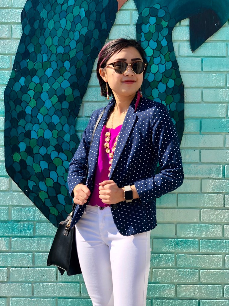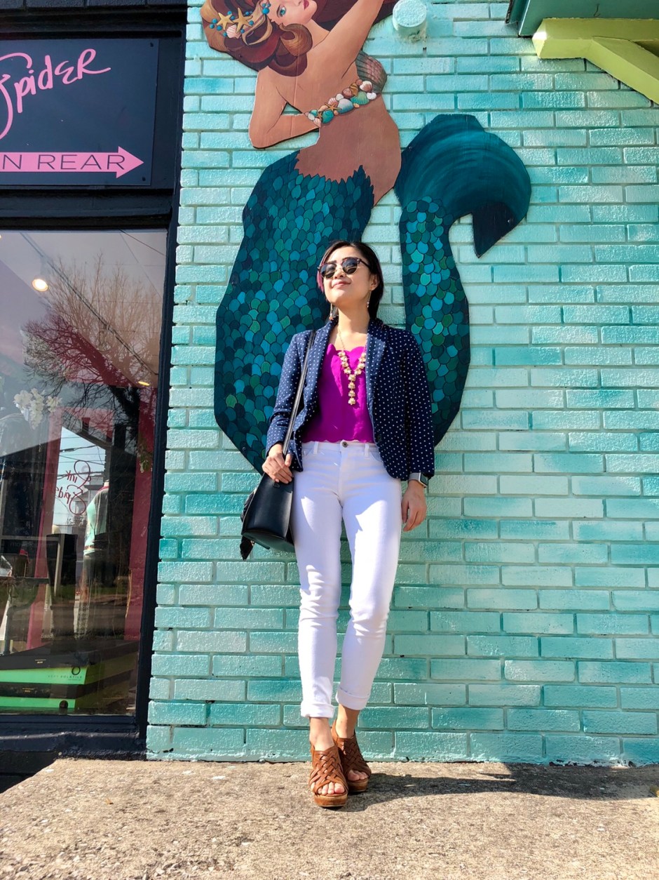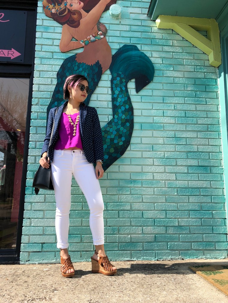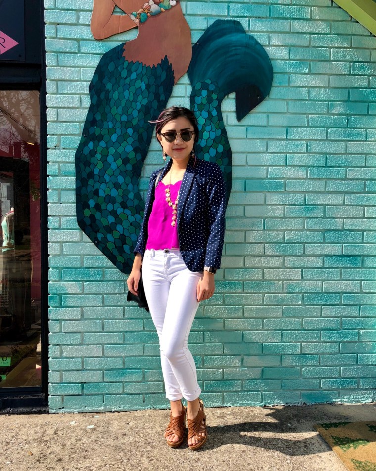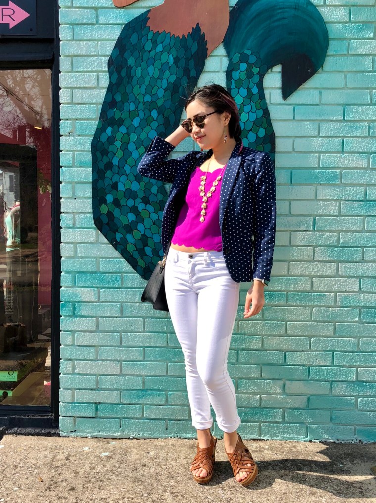 I’m beginning to break out some of my spring clothes now, even though it still doesn’t really look or feel like spring in Kentucky or Indiana yet. Maybe my white jeans, bright colors, and polka dots can convince the sun to come out a little more?